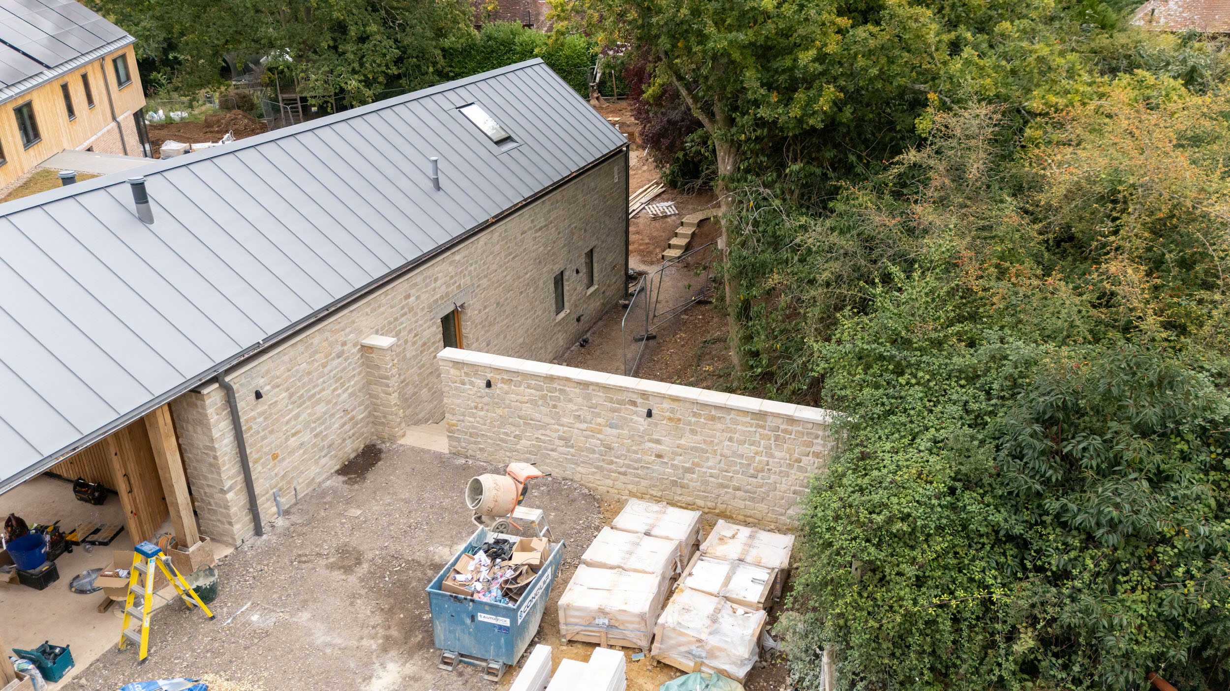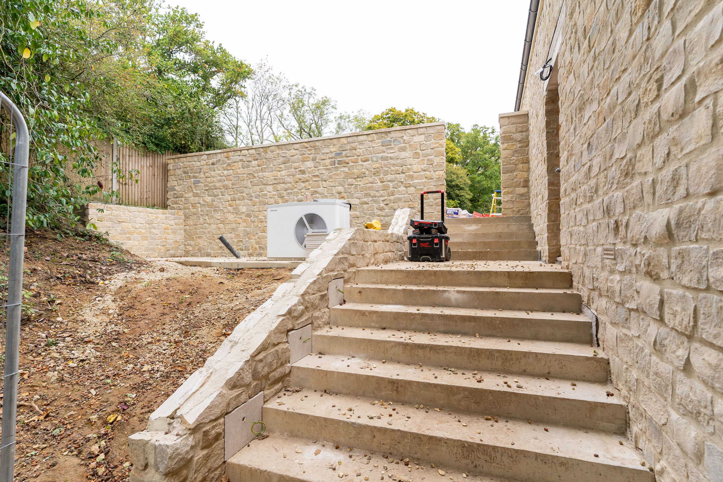 Stonework with Lime Mortar: Planned installation of traditional stone features using breathable lime mortar for a heritage finish.