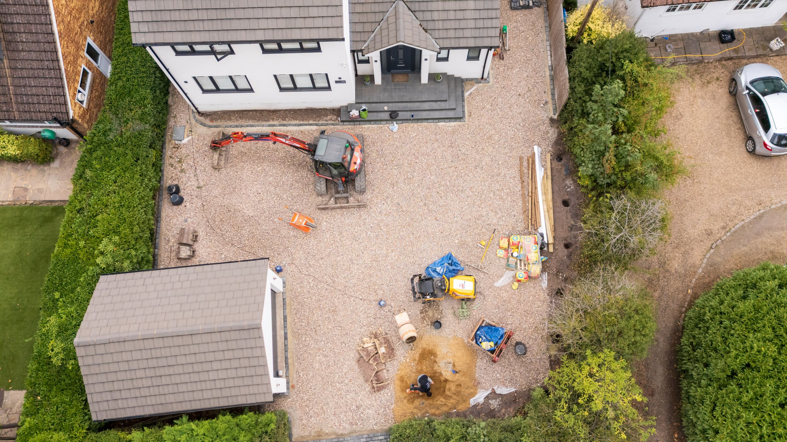 Groundworks: Reduced dig carried out with a 5-tonne machine, followed by the build-up of a SuDS-compliant aggregate base.