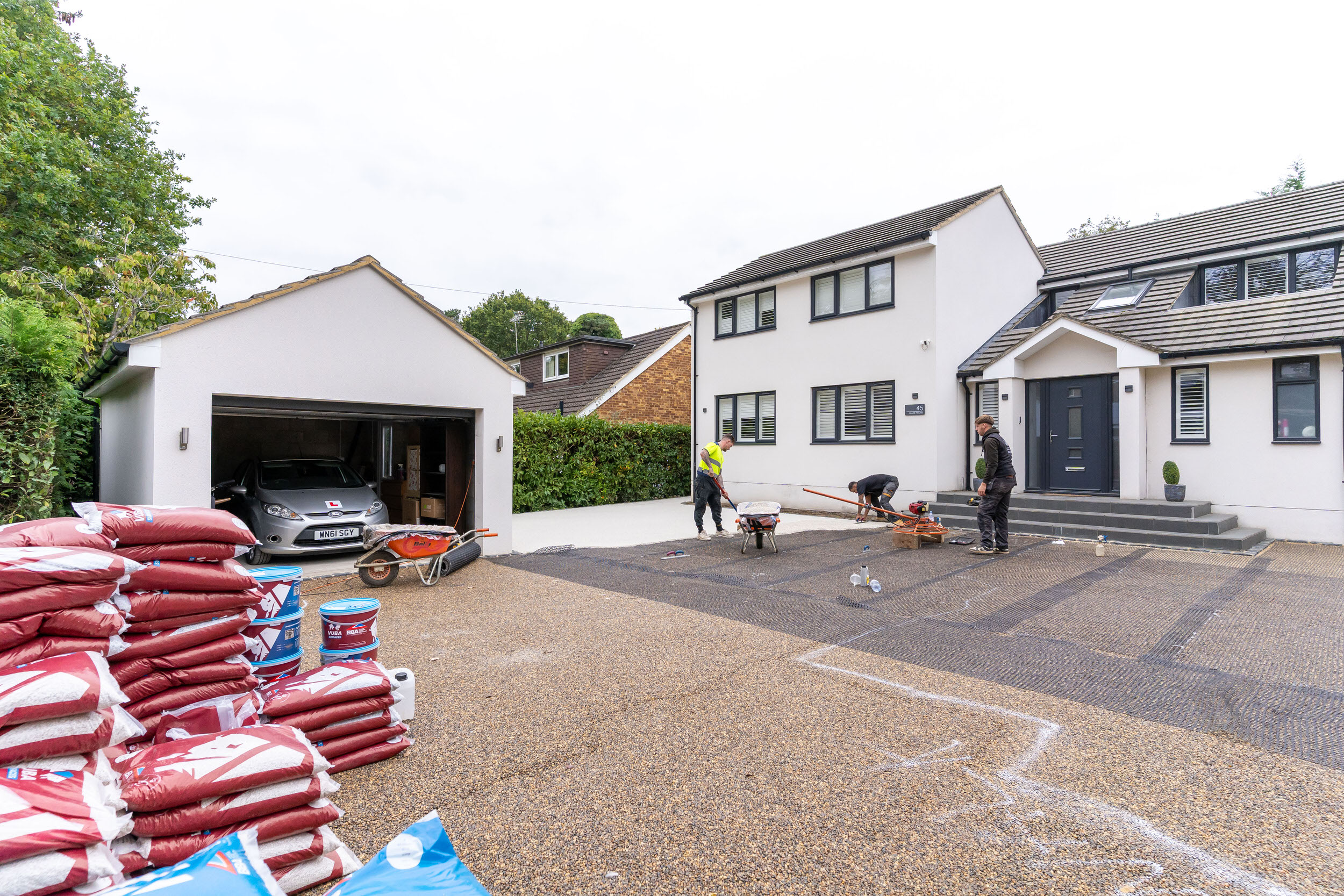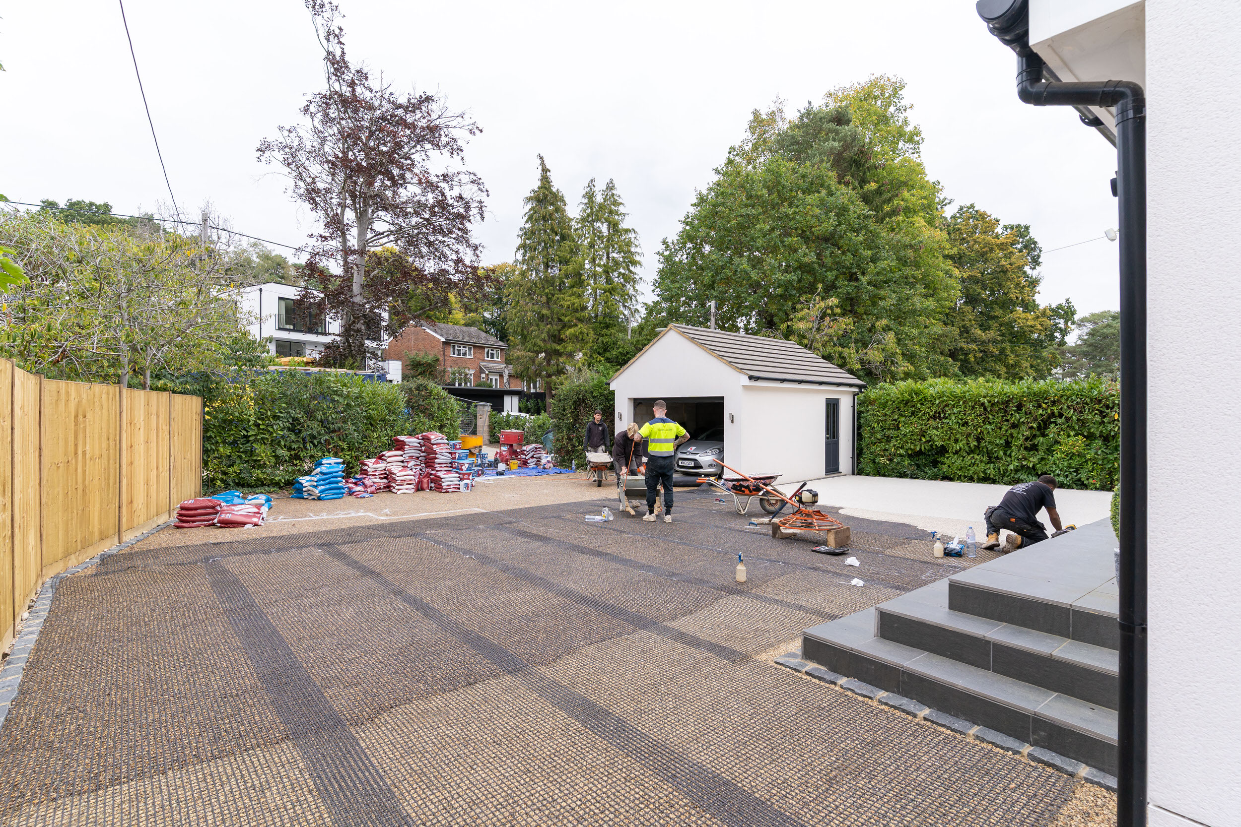 Resin driveway installation and external works package, combining a SuDS-compliant base, premium resin system, edging, paving, and fencing.