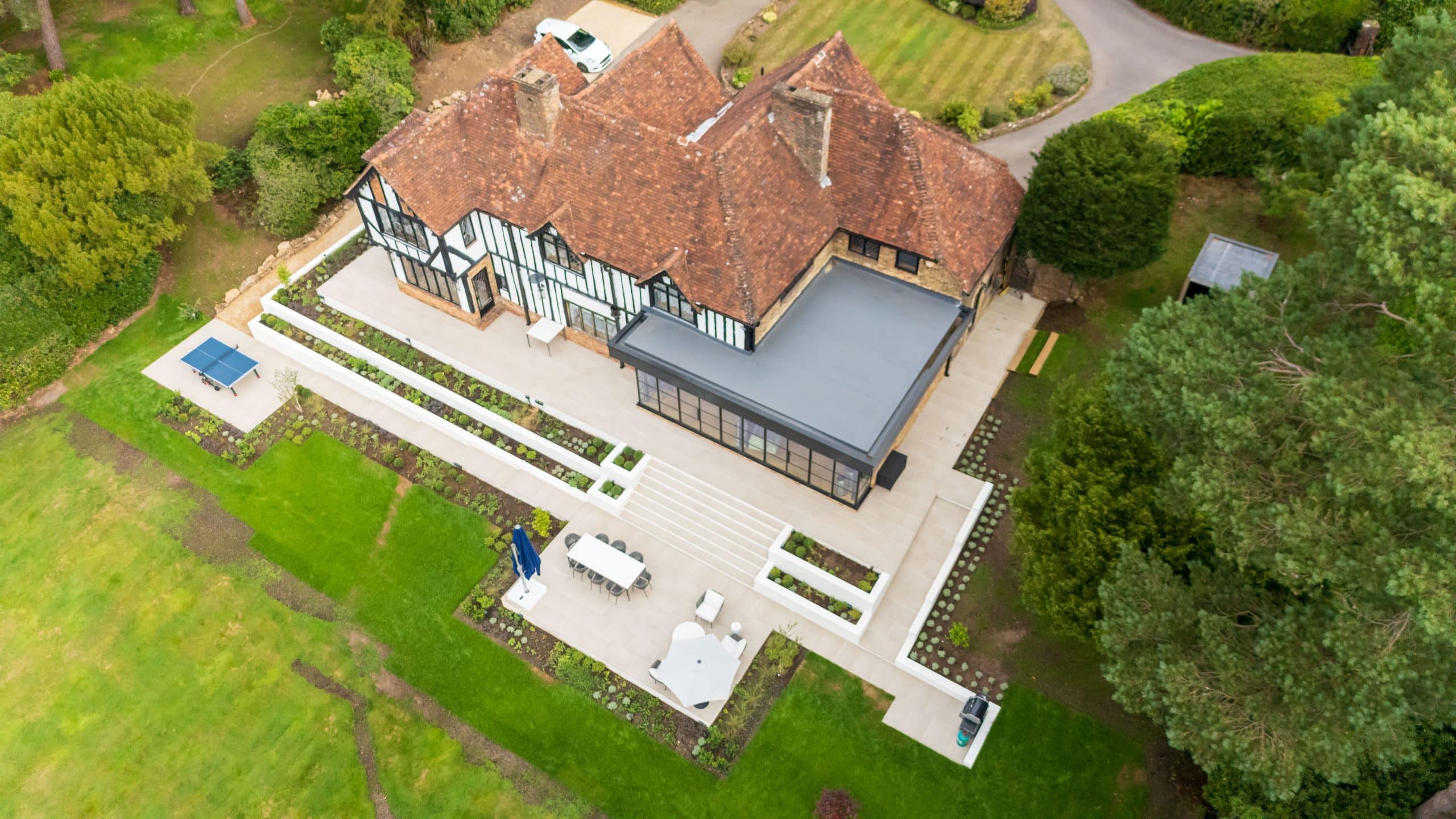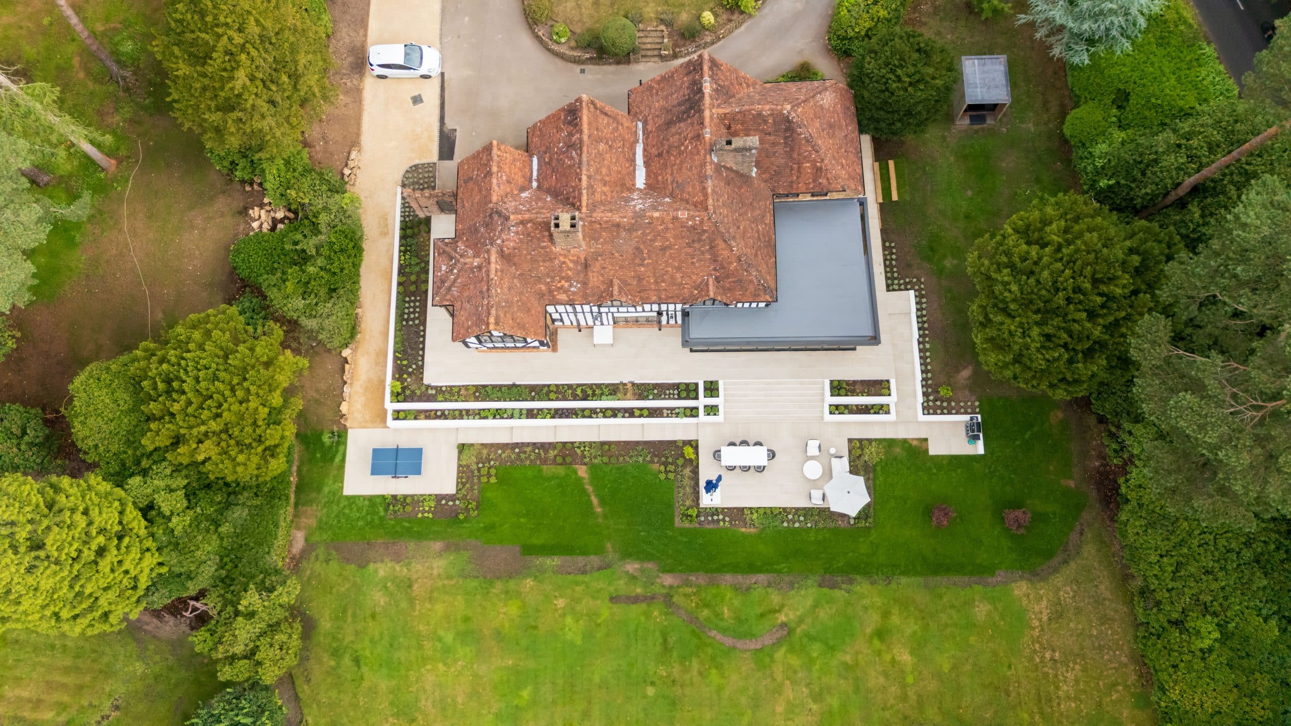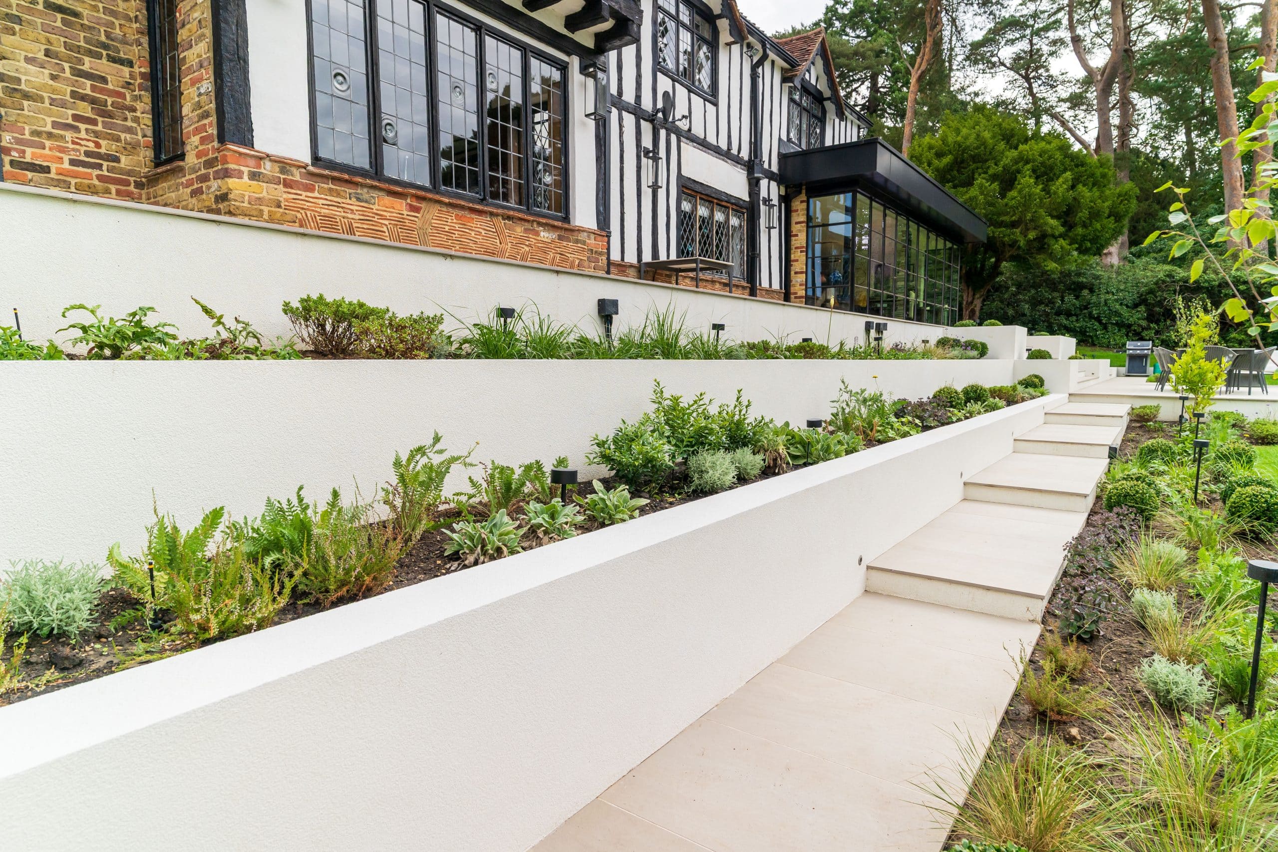 Hard and soft landscaping package in Farnham for Agincourt Contractors Ltd, including porcelain paving and a detailed planting scheme.