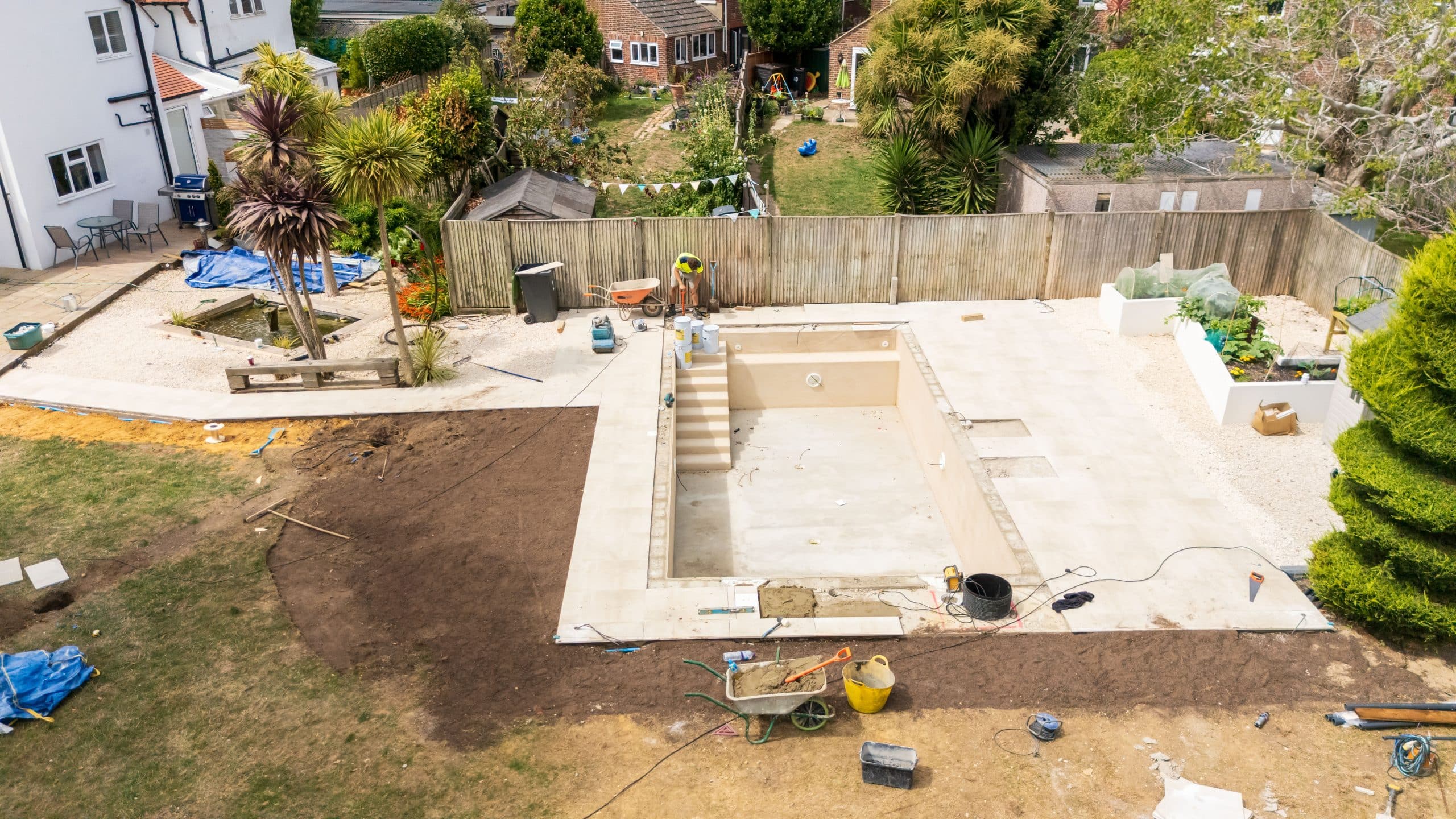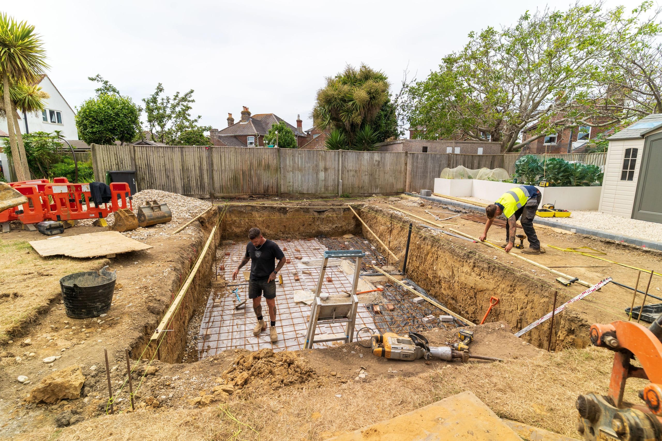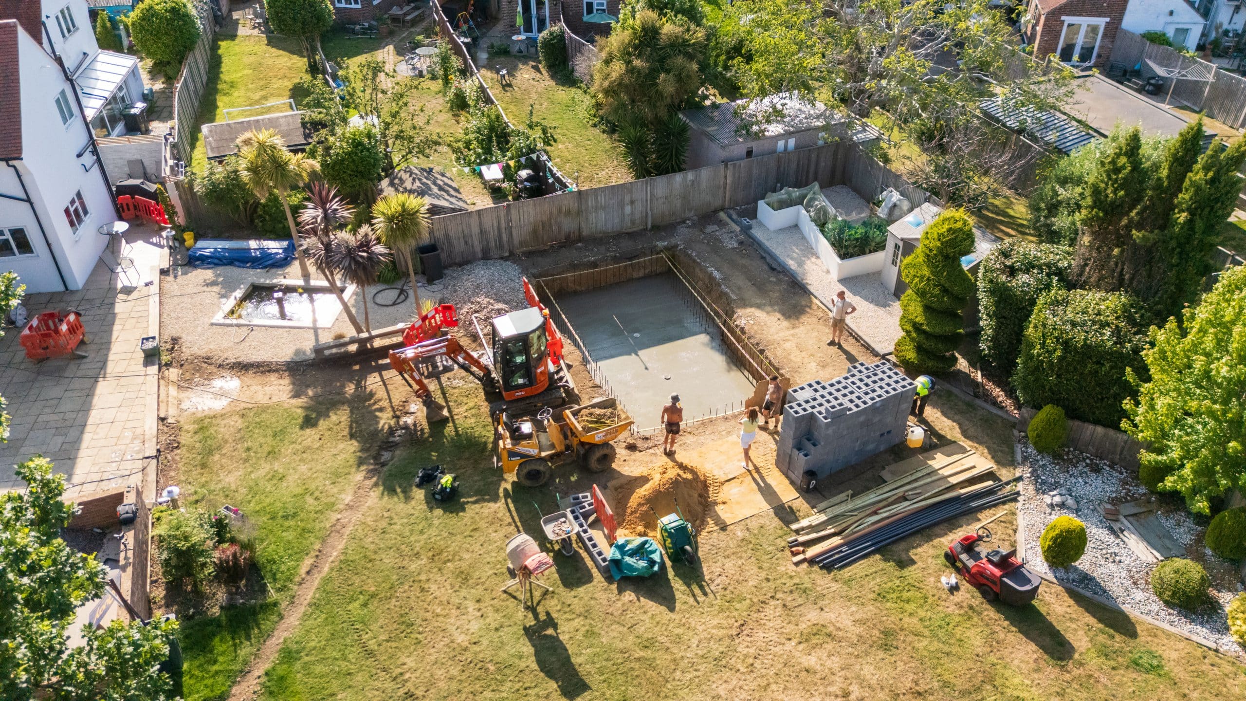 Full swimming pool construction project, delivering a complete build package from groundwork through to finishes and external landscaping.