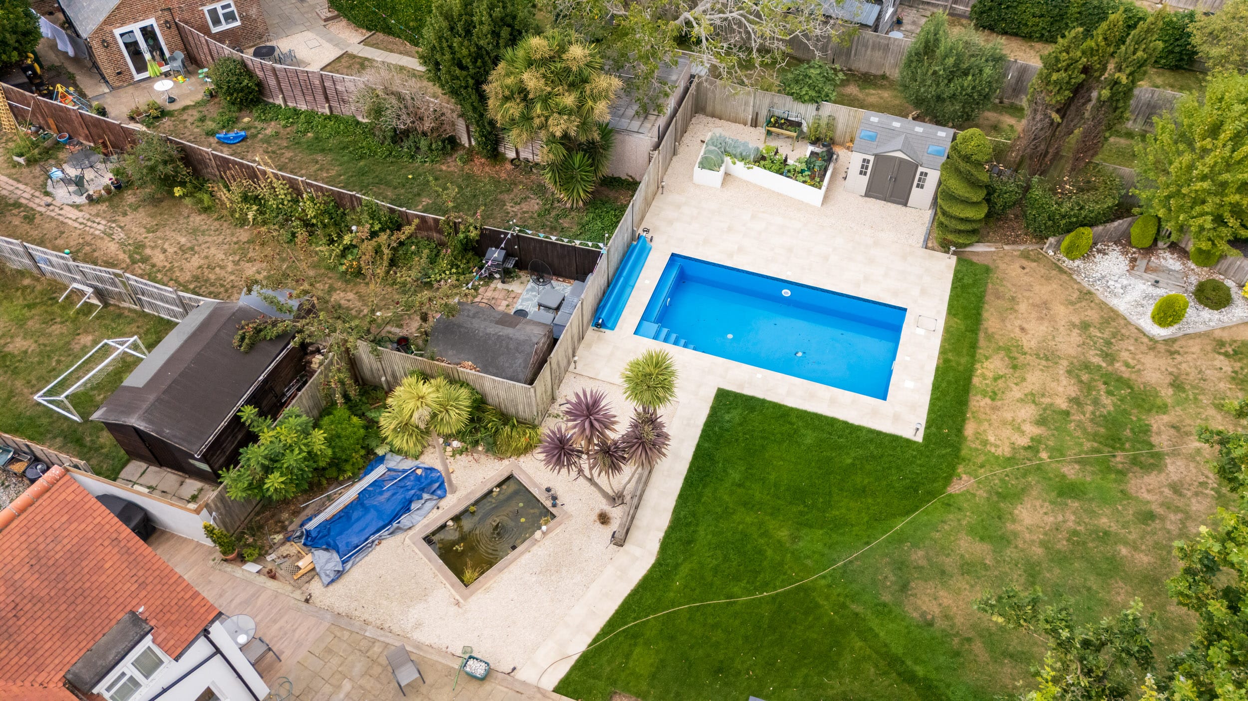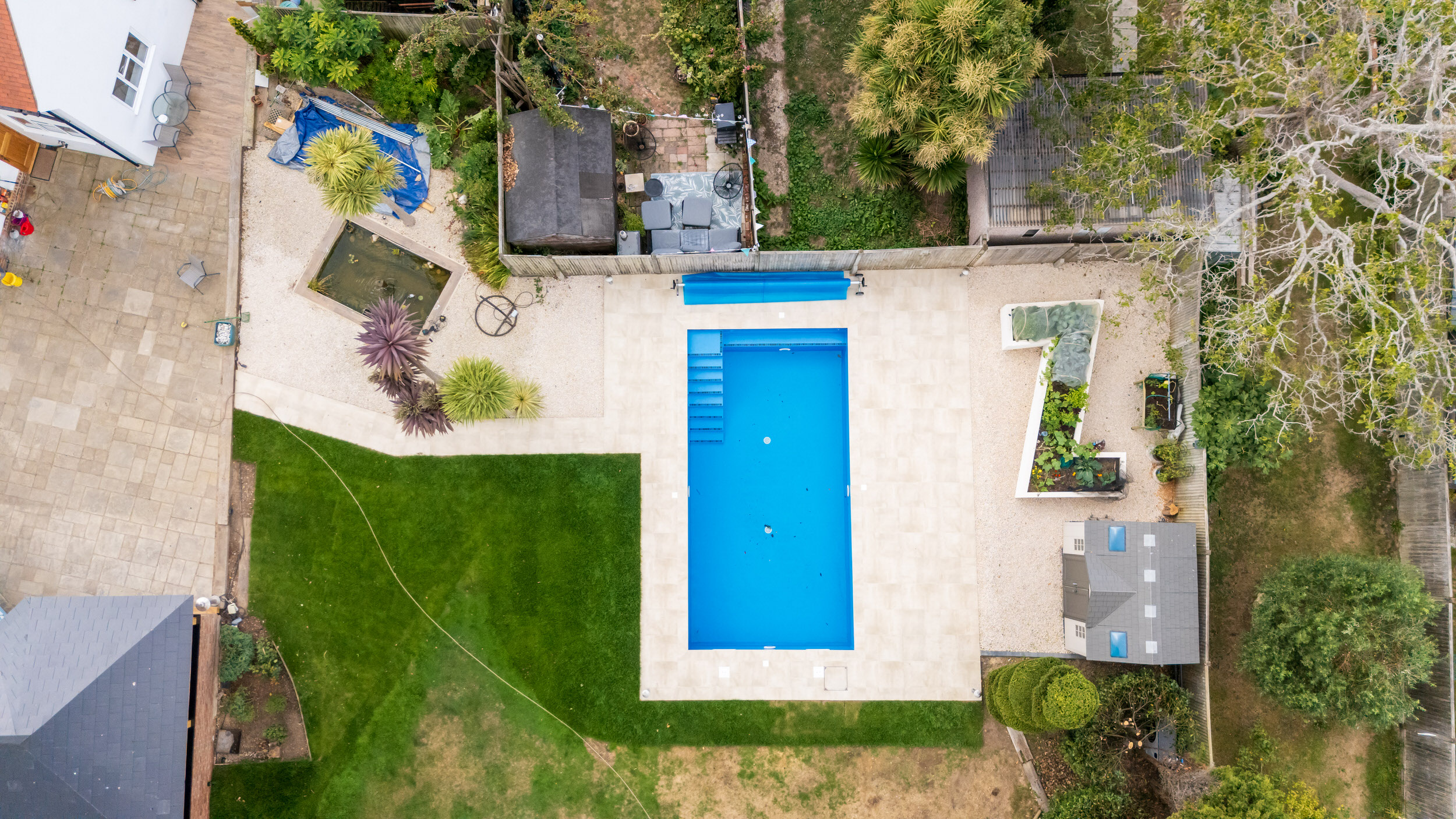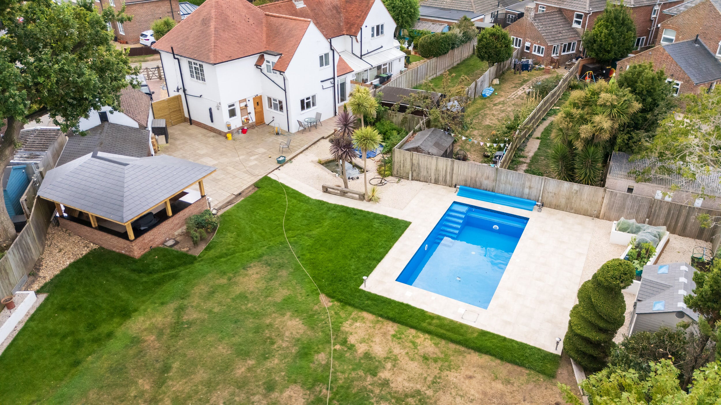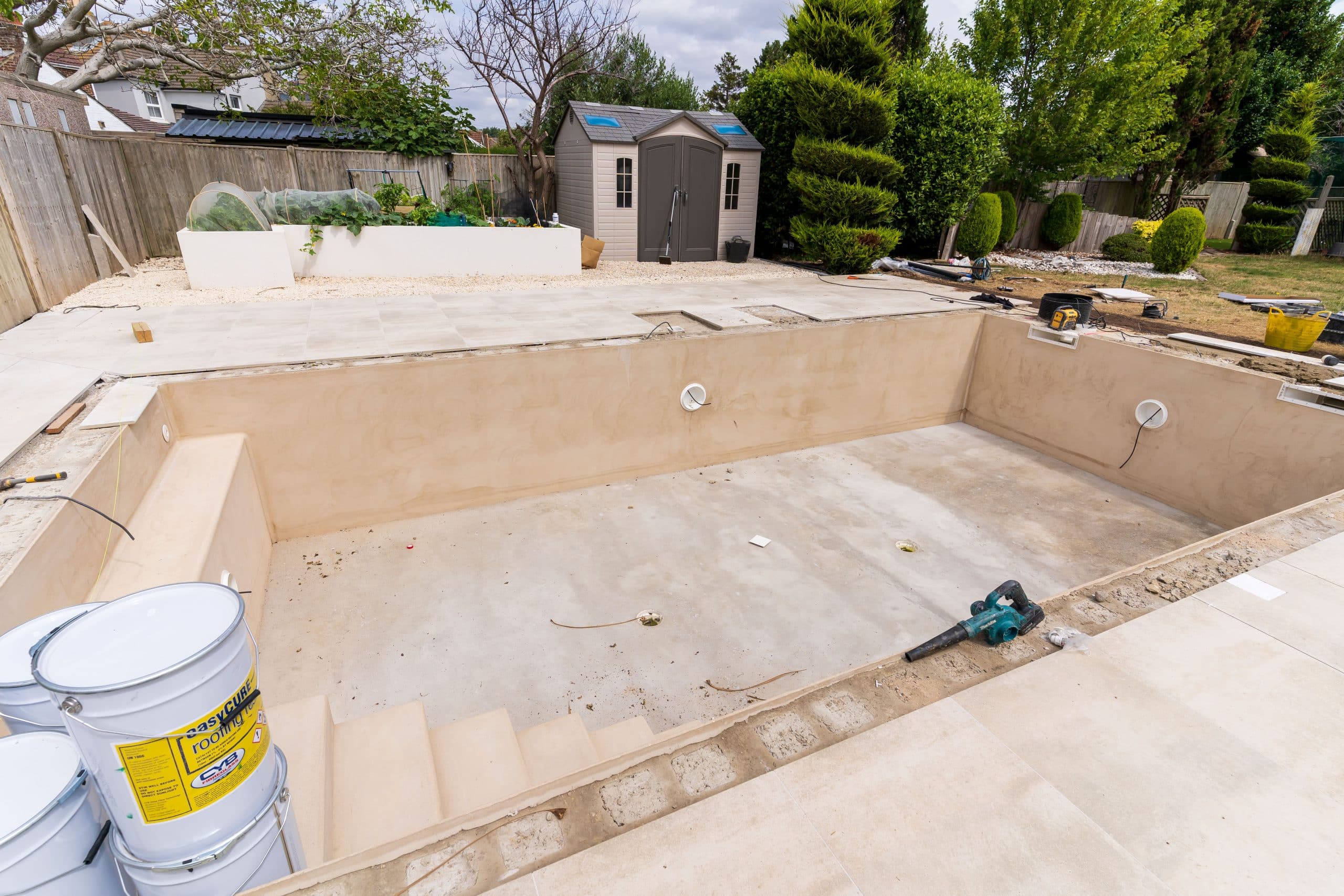 Full swimming pool construction project, delivering a complete build package from groundwork through to finishes and external landscaping.