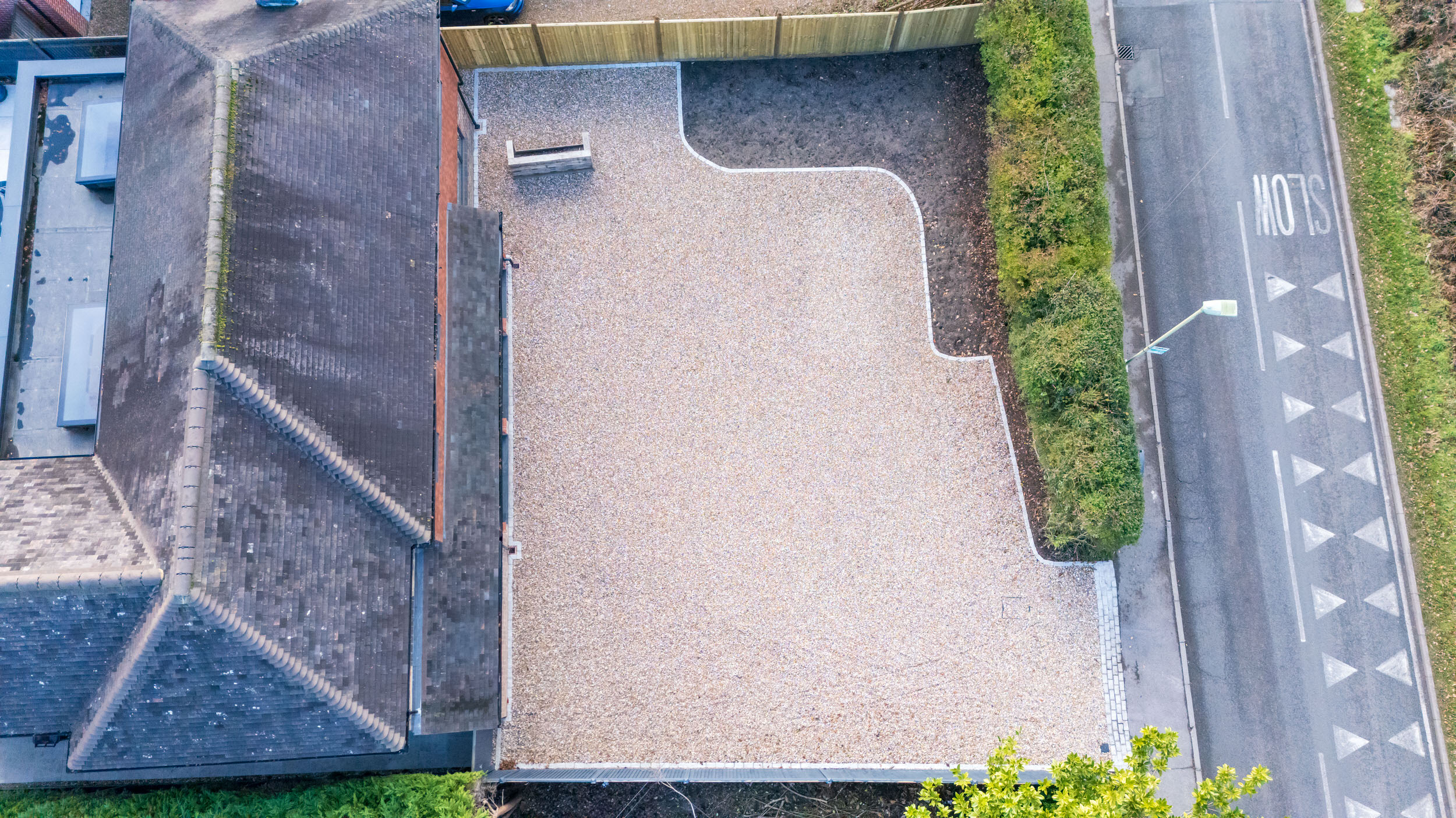 Front garden landscaping project, combining a new gravel driveway with high-quality paving and granite detailing.